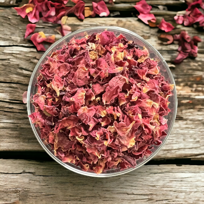 Ici, ce sont les pétales de rose issus de roses de couleur rouge. La beauté naturelle de ces pétales de rose est telle, qu'évidemment, on les utilise fréquemment pour la décoration: pots-pourris, collages de toutes sortes, décoration de plats cuisinés ou de salades, décoration de table. Mais ils ont bien d'autres cordes à leur arc...!