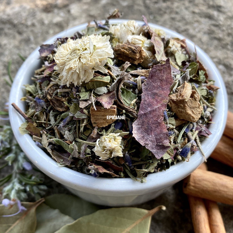 Gentiane - Cannelle - Camomille romaine - Angélique - Vigne rouge - Menthe - Lavande - Diverses herbes aromatiques -