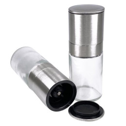 Salt and pepper grinders made of glass (small and thick), featuring a stainless steel grinding mechanism and a continuously adjustable ceramic grinder. Individually packaged in transparent PE boxes.