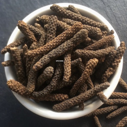 Long pepper is the fruit of a vine that grows only 1 to 1.5 meters high, belonging to the Piperaceae family, native to India and growing wild on the foothills of the Himalayas. This vine can produce year-round but only for 3 to 5 years; afterward, the plant must be regenerated. Therefore, harvesting is often done from wild vines.