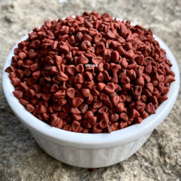 To use annatto, mix it with vegetable oil or pre-heated water (10g of annatto for 100ml of oil or water). Let it steep for a few days until the seed coating softens and the black seeds are released from inside. Remove the black seeds, press the remaining pulp to extract all the juice, and then filter the solution (e.g., through a coffee filter). Alternatively, you can blend the whole seeds and then mix the resulting powder with water or oil in the same proportions. Allow it to rest and remove the sediment by filtering again. You will then have red oil or red water that can be diluted in your dishes and other preparations.