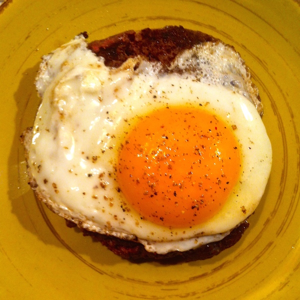 Faites cuire alors votre oeuf au plat en remplaçant aussi le sel et le poivre par quelques pincées de Vigneron. Puis déposez-le avec soin sur votre steak haché cuit. C'est prêt!