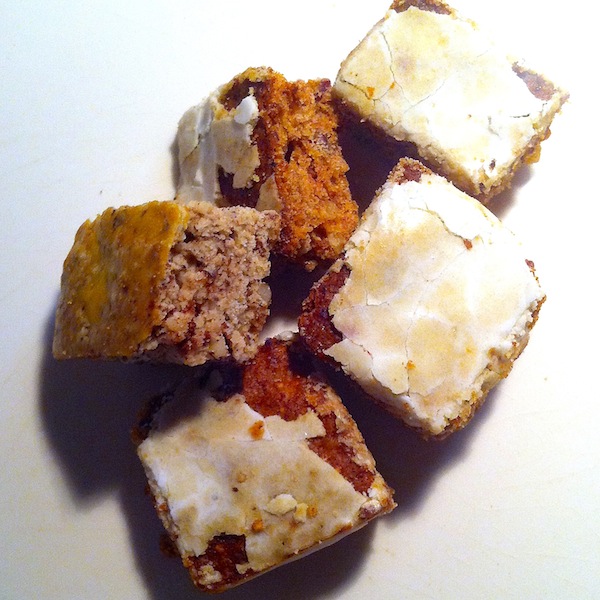 Vous pourrez enfin, toujours comme sur la photo, préparer un glacis à base de fondant (dans les rayons spécialisés en pâtisserie) que vous ferez fondre dans une petite casserole sur feu très très doux et que vous napperez, soit sur toute votre plaque de pain d'épices cuite, avant de la découper, soit dans lequel vous passerez rapidement une face de vos petits carrés après leur découpe.