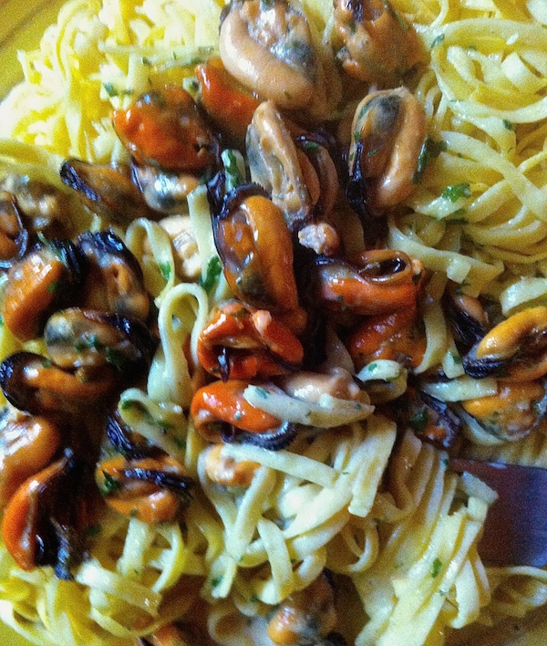 Quand tout est chaud, installez les pâtes sur les assiettes et versez la préparation des moules et de la crème dessus. Votre repas est prêt...!