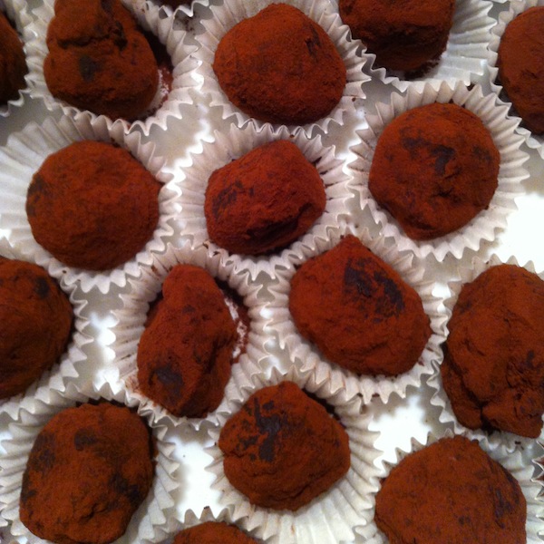 Laissez refroidir et durcir la pâte à truffes au réfrigérateur (1 à 2 heures). Formez alors vos truffes en prenant une grosse cuill. à café de préparation que vous roulerez entre vos doigts (les truffes doivent faire environ 3cm de diamètre ou plus, si vous aimez).