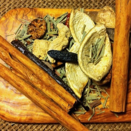 Cannelle, écorces d'orange amère, gingembre, citronnelle, fève de Tonka, muscade, girofle, piment