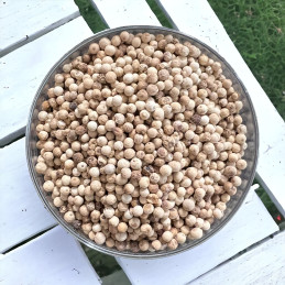 3°) De witte peper, die bestaat uit bessen die volledig rijp zijn, waarvan de schil wordt verwijderd na weken weken, en die vervolgens worden gedroogd totdat ze wit worden. Het wordt als minder pittig dan de zwarte peper beschouwd en heeft een fijnere smaak. Wat zeker is, is dat de smaak anders is dan de zwarte peper, ongeacht de oorsprong van de peper, en het voordeel is dat het geen zwarte korrels achterlaat in witte sauzen.